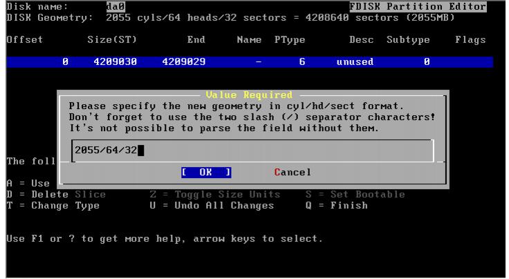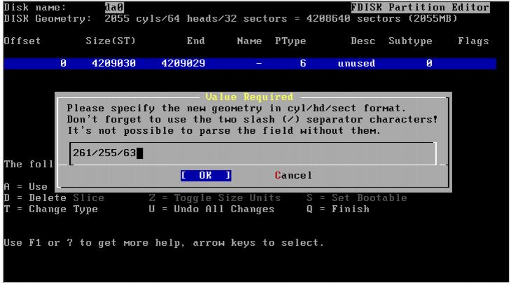 4 You can now enter the correct geometry of 261 cylinders, 255 heads and 63 sectors per head by typing 261/255/63 in the dialog box. Then click OK and continue installing FreeBSD.