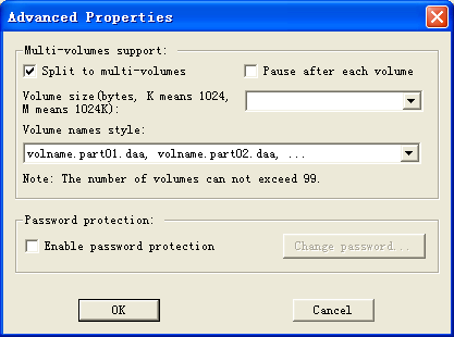 To enable splitting to multiple volumes, check "Split to multi-volumes", enter volume size, then choose volume name style.
