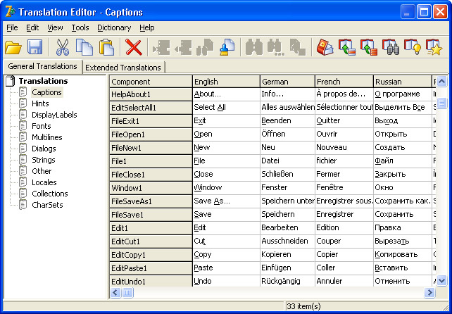Translations Editor allows editing both general and extended translations. Please read Using Extended Translations topic to learn the details of working with Extended Translations property.