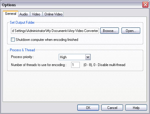 You can make other relevant settings such as audio volume, video parameters, in the Options window of the program. Click the Options button in the left bottom of the main window, you will see the Options window as the following: