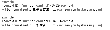 The CONTEXT tag specifies the normalization of a block of text. This specification defines the SAPI predefined attributes (ID) for the CONTEXT tag. These IDs are strings. SAPI does not validate any parameters on the string passed to the engine, and hence, the application can specify engine-specific normalization IDs to the engine. Engine-specific strings begin with the engine vendor's name to avoid confusion between engines.